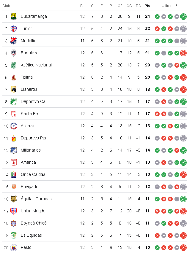 El líder Atlético Bucaramanga sigue firme con 24 puntos y quiere mantenerse en la cima, mientras Junior de Barranquilla y Medellín acechan muy de cerca. Fortaleza se ha convertido en la gran sorpresa del campeonato y no quiere soltar el cuarto lugar.