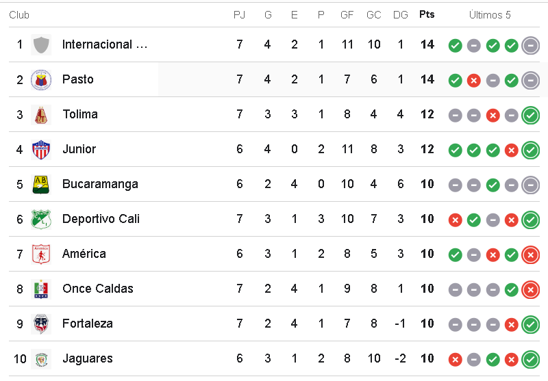 En lo más alto aparecen Internacional de Bogotá y Deportivo Pasto, ambos con 14 puntos, compartiendo el liderato en una lucha intensa por consolidarse como candidatos al tÃtulo. Muy cerca se encuentra Deportes Tolima con 12 unidades, mientras que Junior de Barranquilla, con un partido menos, también suma 12 puntos y amenaza con adueñarse de la punta si logra ganar su compromiso pendiente.