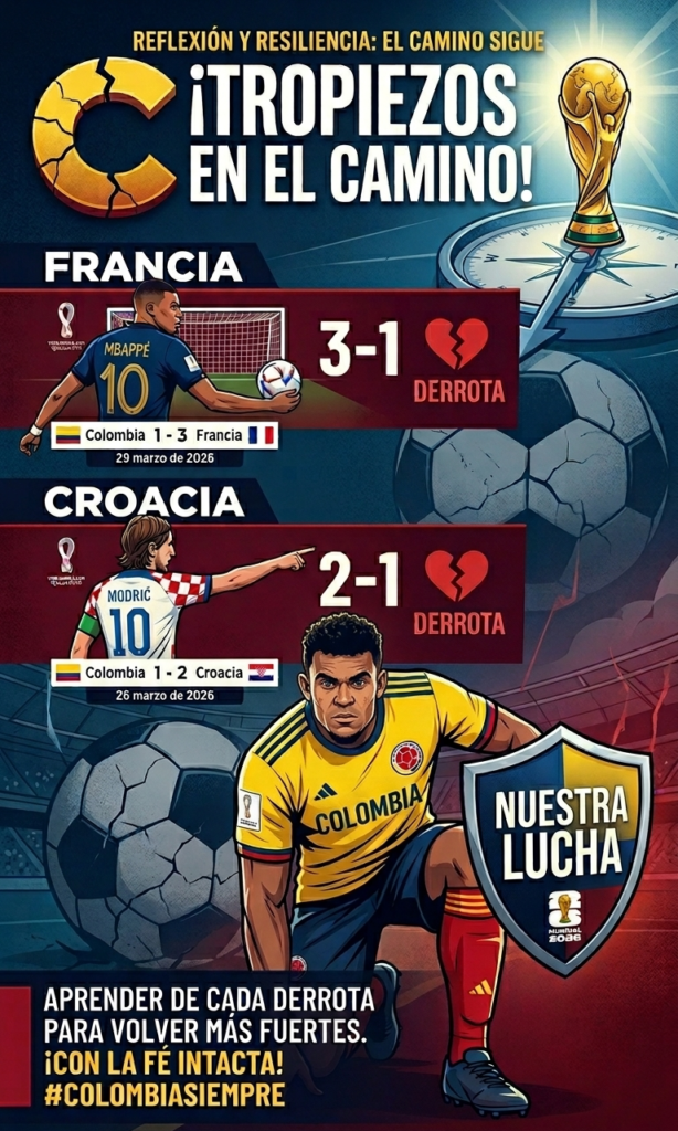 Posteriormente, el 29 de marzo, la tricolor volvió a sufrir, esta vez frente a una potente selección francesa que se impuso 3-1. El único tanto colombiano fue obra de Jaminton Campaz, mientras que Francia mostró superioridad en varios tramos del encuentro.