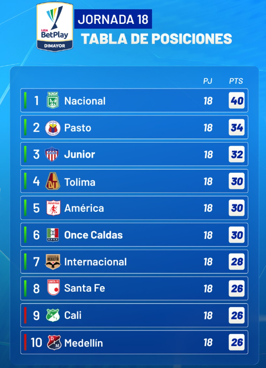 En la parte alta, Atlético Nacional se mantiene como líder sólido con 40 puntos, pese a su caída en esta jornada ante Deportivo Pereira. Lo siguen Deportivo Pasto con 34 puntos y Junior de Barranquilla con 32, ambos prácticamente clasificados.